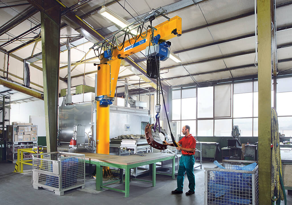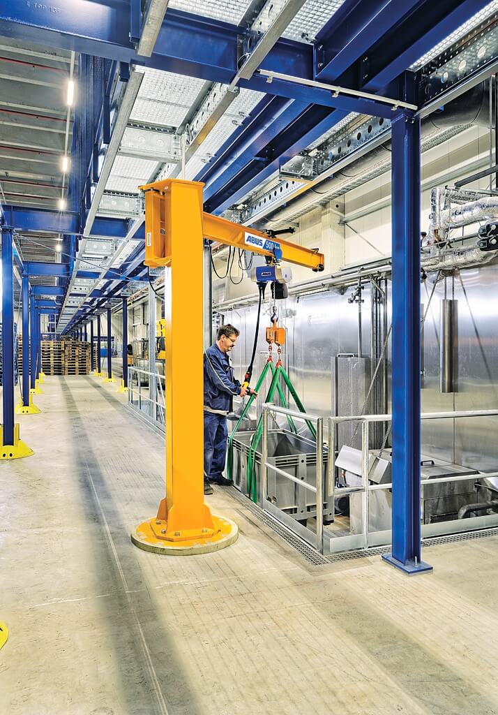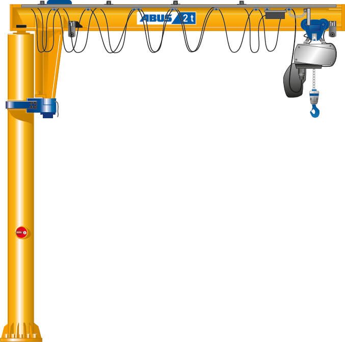 ABUS søjlesvingkraner er den simple, men gode løsning på et kransystem. Søjlesvingkraner kan anvendes direkte på arbejdspladsen til en lang række forskellige arbejdsopgaver. Søjlesvingkranerne kan let monteres i din bygning, uanset om du har snævre indbygningsforhold, skal bruge store løftekapaciteter eller skal løse specielle arbejdsopgaver. Vi kan tilpasse alle søjlesvingkranerne til dine lokale forhold, grundet deres gode tilpasningsmuligheder dette sikrer, at de altid er optimeret til dine lokale forhold. Søjlesvingkraner giver dig fri placeringsmulighed, ofte uafhængig af bygningskonstruktionen. Kranerne vil dog optage lidt gulvplads og kan kræve et ny støbt fundament under svingkranen, såfremt dit eksisterende gulv ikke er stærkt nok. Når din nye søjlesvingkran er monteret, vil du til gengæld stå med en svingkran, der tilbyder store svingområder, løftekapaciteter og udlæg op til 10 meter. Dette giver dig et fremragende arbejdsområde, hvori du hurtigt, let og sikkert kan transportere tungt gods.